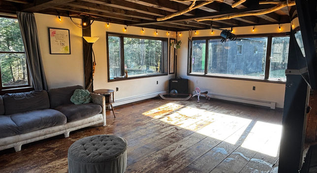 Light, bright, and unique post and beam gambrel home situated on top a sunny hill in the woods of Lebanon with great outdoor play spaces, firepit and walking trails. This open concept Gambrel home has an open spacious first floor with a beautiful stone fireplace, exposed wood, and the feel of a grown up tree house. Kitchen has been refreshed with paint and is equipped with practical built in shelving and hooks to maximize storage. Living/dining area offers the freedom to create spaces in the way you choose. With a lovely deck and slider, the living area also has large windows to invite the light into the space. Upstairs there are three spacious bedrooms and full bathroom with doors both on the hall and to the primary bedroom. Skylights invite even more light into the space. Roof is newer. Oil tank is new. Leach field and septic pump are new as is the well pump. House exterior has been recently painted. Barn is a great place for projects and has electricity. There is also a rock pathway in the backyard that leads to a treehouse in the woods. The land invites exploration. Make this lovely spot yours. Showings begin at Open House, Saturday April 25th 10 am - 12 pm.